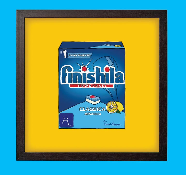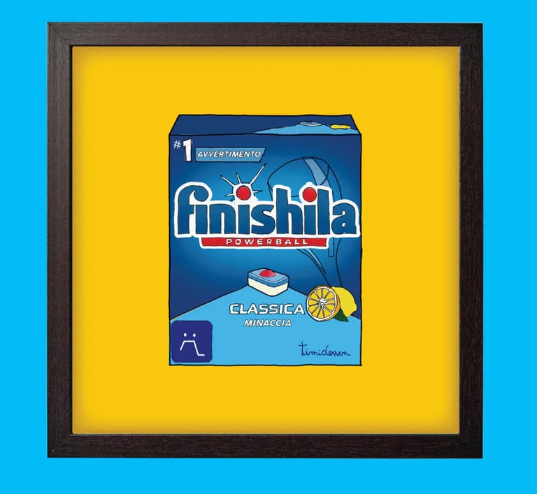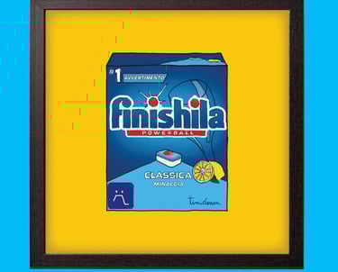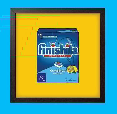 “Finishila” ha una grafica essenziale e colori forti che lo rendono perfetto anche in un living moderno o minimal. È il classico esempio di come un dettaglio pop possa convivere con arredi più sobri.
